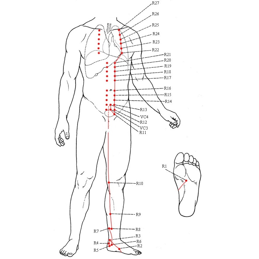 Меридиан почек – парный, симметричный, центростремительный, относится к системе инь. Насчитывает 27 точек акупунктуры на каждой стороне.