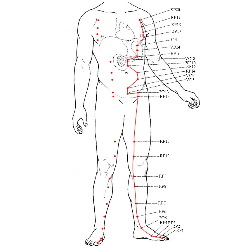 Меридиан селезенки – поджелудочной железы – парный, симметричный, центростремительный, относится к системе инь. Насчитывает 21 точку акупунктуры на каждой стороне