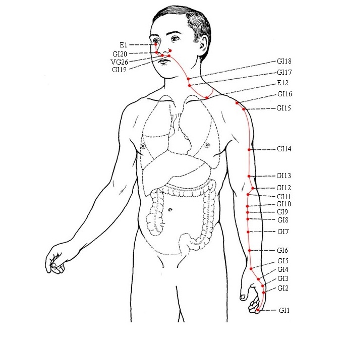 Меридиан толстой кишки – парный, симметричный, центростремительный, относится к системе ян. Насчитывает 20 точек акупунктуры на каждой стороне