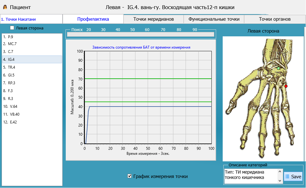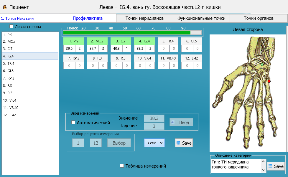 Переключите прибор “Doctor-3” в режим измерения методом "Накатани” и соедините прибор с USB разъёмом гаджета. Запустите приложение “Doctor”. Заведите нового пациента или выберите его со списка. Войдите в режим “Измерение” и нажмите меню “Профилактика” затем “1. Точки Накатани”. Измерения начинаются с первой точки P.9. до последней E.42 с левой стороны. Перейдите на правую сторону. Установите флажок возле “Левая сторона”, появиться надпись - “Правая сторона”. Повторите измерения с первой P.9. до последней точки E.42 по правой стороне. Сохраните результаты измерения! Нажмите клавишу “Save” (которая ближе к центру, так как есть еще клавиша Save для сохранения текста).
