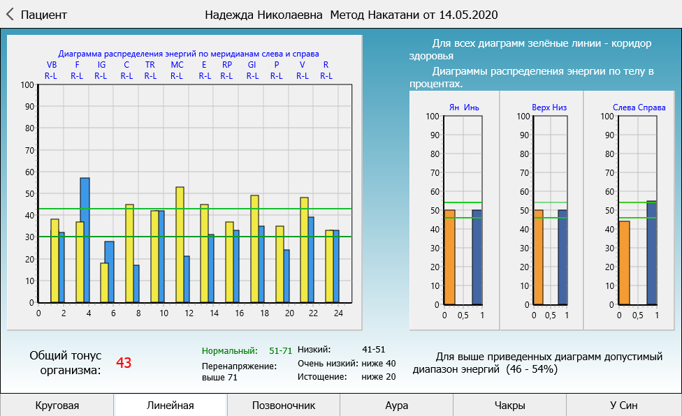 Коридор здоровья для каждого пациента рассчитывается по результатам его измерений. Берется среднее арифметическое 24 измерений и добавляется константа 6,7 – верхний предел, вычитается 6,7 – нижний предел коридора.