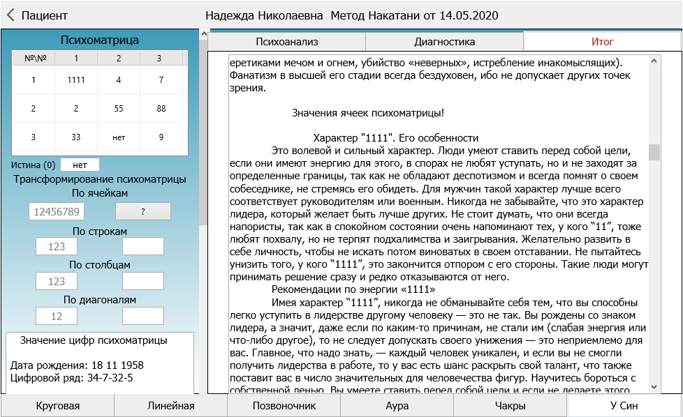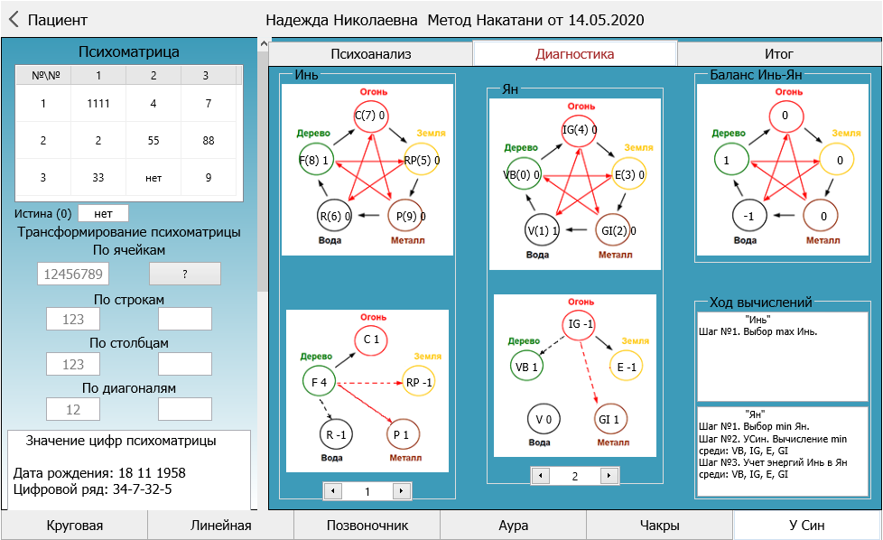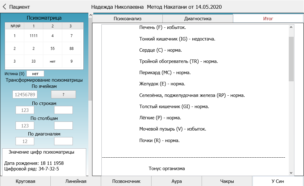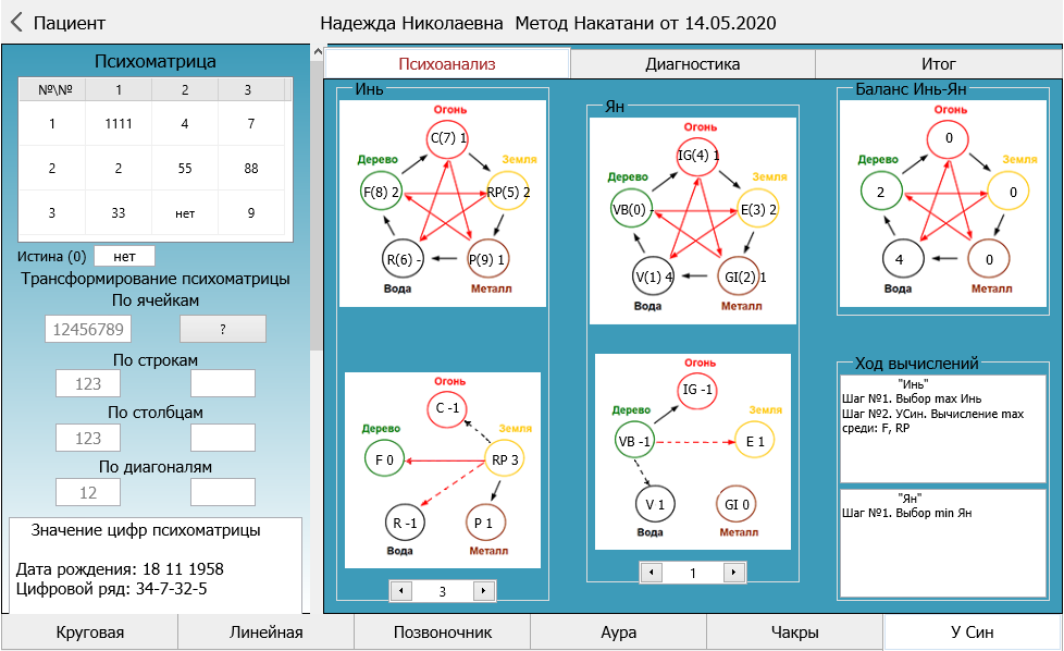 На этой странице рассчитывается психоматрица человека по дате рождения и проводится анализ энергетического состояния меридианов по У- Син, то что дано человеку от рождения и по диагностике.