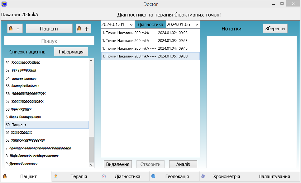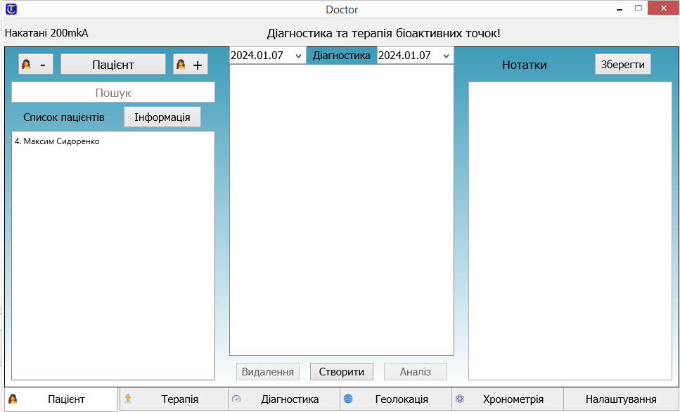 У списку пацієнтів утворюється новий пацієнт. Для цього пацієнта можна робити нотатки у полі «Нотатки». Щоб зберегти нотатку, натисніть «Зберегти». Вибираємо пацієнта та натискаємо меню «Діагностика». Заходимо на панель «Діагностика».