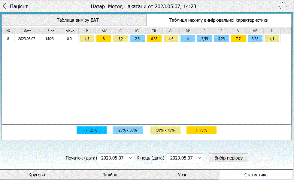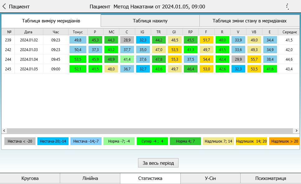 Результати діагностики заносяться в основу програми і можна відобразити, вибравши меню «Статистика» Рис.15. На Мал.8 показані вимірювання за період, вибраний за датами з 01.01.2024 до 06.01.2024. Всі ці виміри обробляються виходячи з чого визначається достовірність виміру в кожному органу. Для наступної оцінки Мал.15 виводяться показання, які не потрапили до коридору здоров'я (зелені кольори). Жовті, червоні кольори в органі говорять про надлишок енергії в органі. Сині, сірі кольори відповідають органам із нестачею енергії.