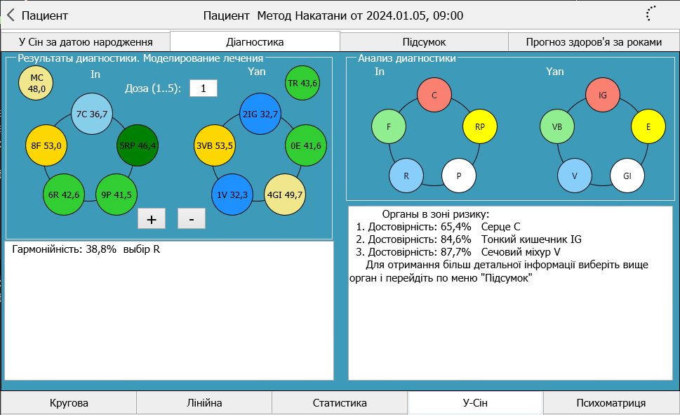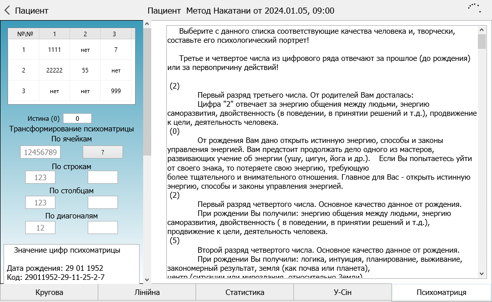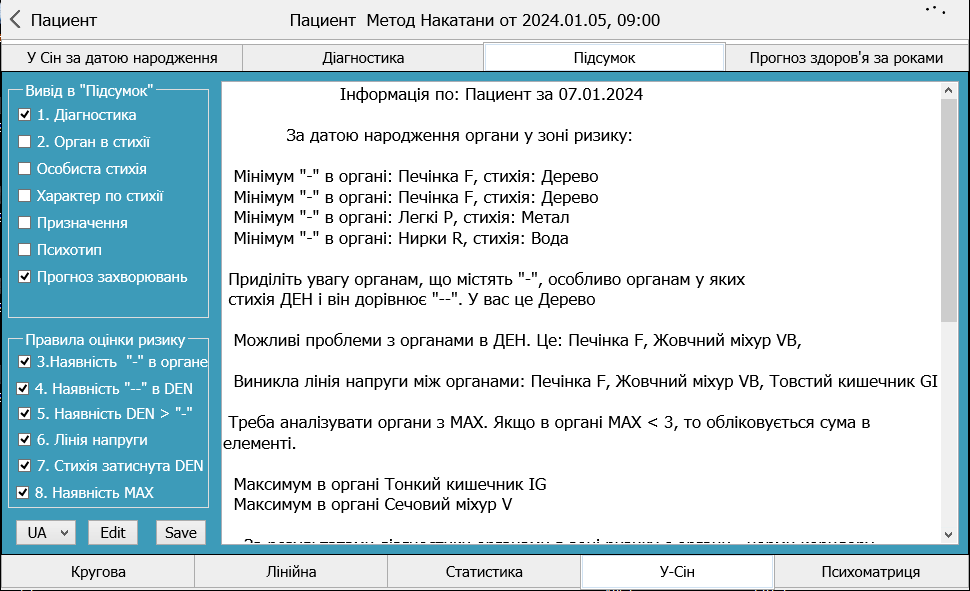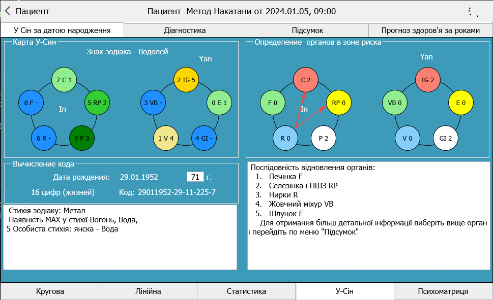 Програма автоматично обчислює всі параметри пацієнта від дати народження за системою У-Сін. Обчислюється стихія зодіаку пацієнта, наявність DEN та MAX у карті У-Сін пацієнта та його особиста Стихія. За значенням особистої стихії будується психологічний портрет пацієнта Мал.14. Також до оцінки психологічного портрета пацієнта можна залучати матрицю Піфагора Мал.19.