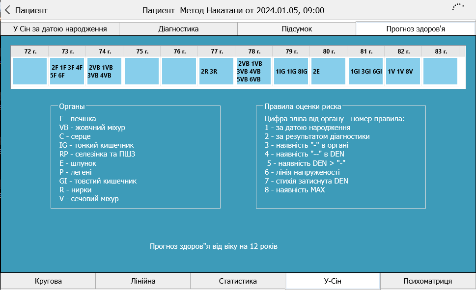 Прогноз здоров'я по рока, починвбчи від віку, пацієнта показаний в Підсумку. Також його можна переглянути, вибравши меню «Прогноз здоров'я».