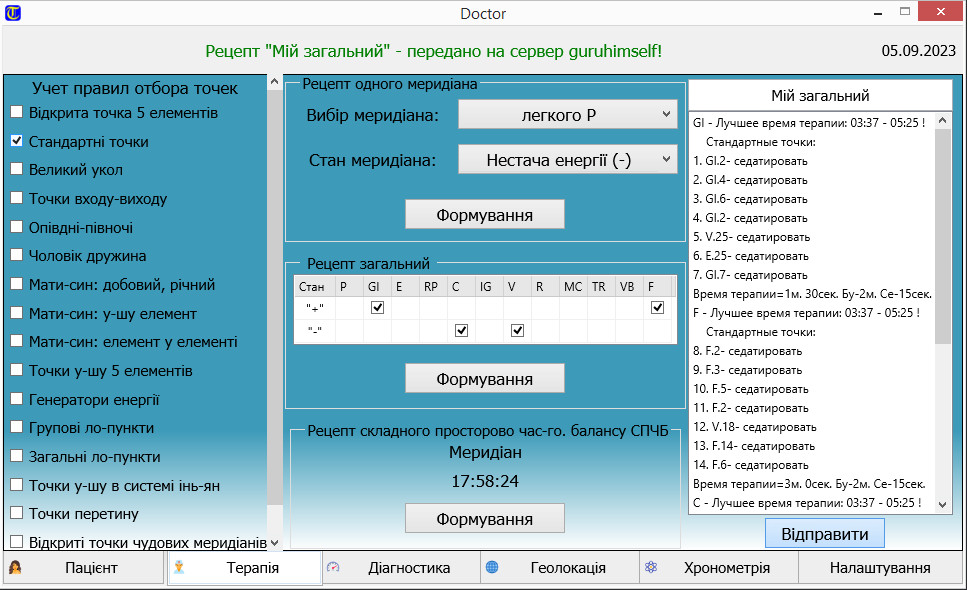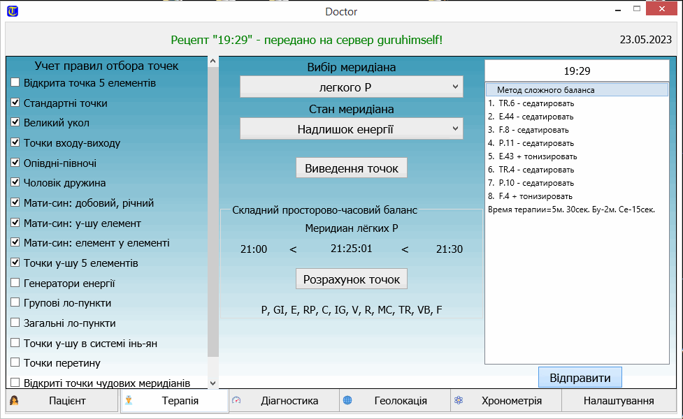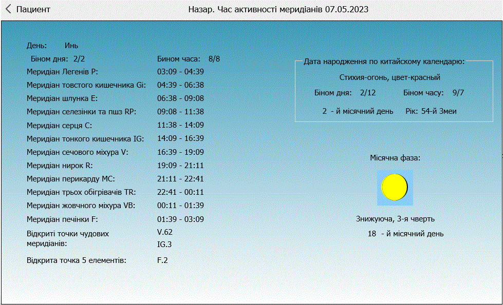 Оптимальний час проведення терапії одного з меридіанів, для даної пори року, визначається на сторінці головної панелі «Хронометрія». Мал.18.
