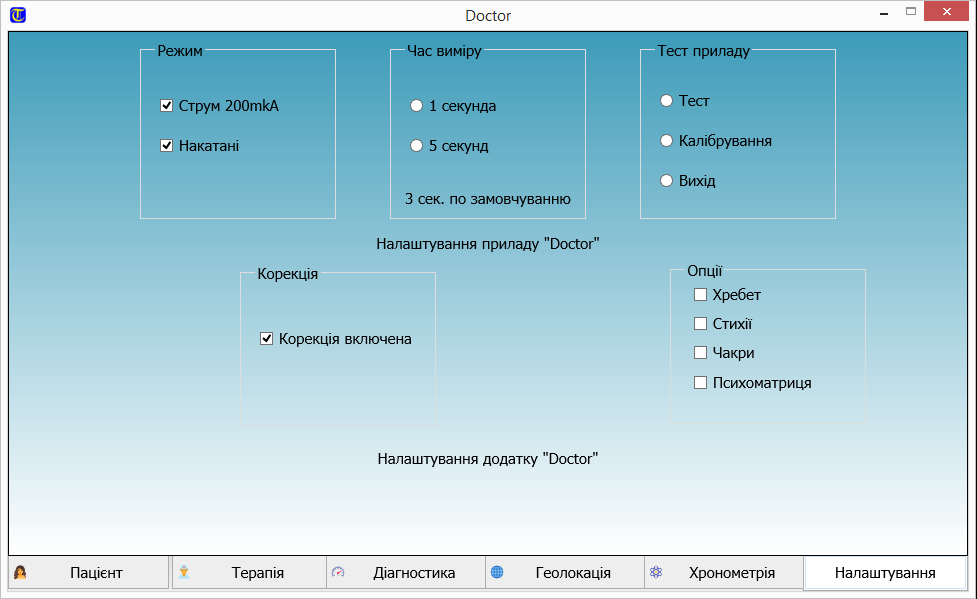 Програма дозволяє розширити аналіз результатів вимірювань. Для цього треба на головній панелі увійти до «Налаштування» Мал.2 та вибрати відповідні опції, такі як «Хребет», «Стихії», «Чакри»/