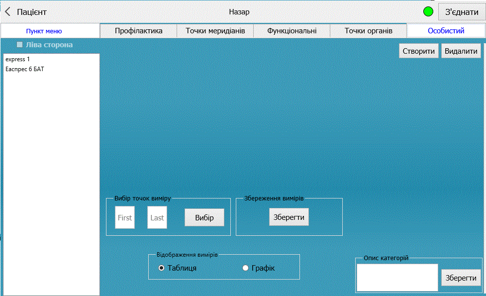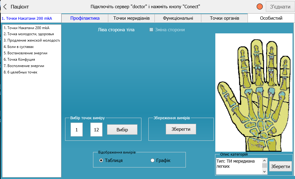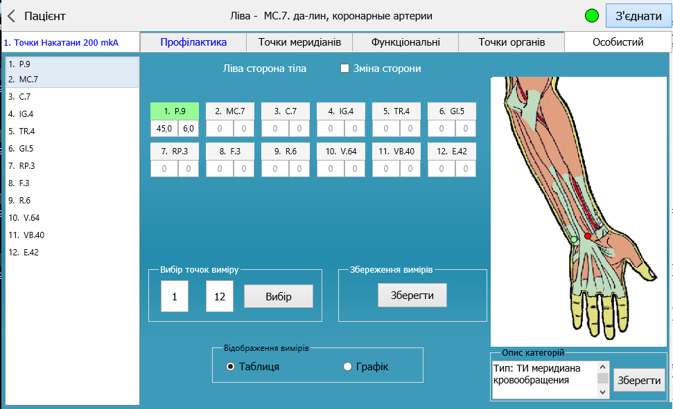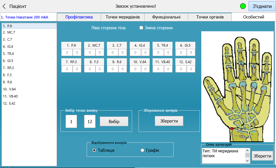 В меню "Профілактика" вибираємо "1.Точки Накатані 200 µA". Потім, вибираємо першу точку P.9. Кнопка «З'єднати» стає активною. Натискаємо кнопку « З'єднати». Помаранчеве коло зеленіє. Тепер можна проводити вимірювання точок Накатані лівої сторони тіла.
