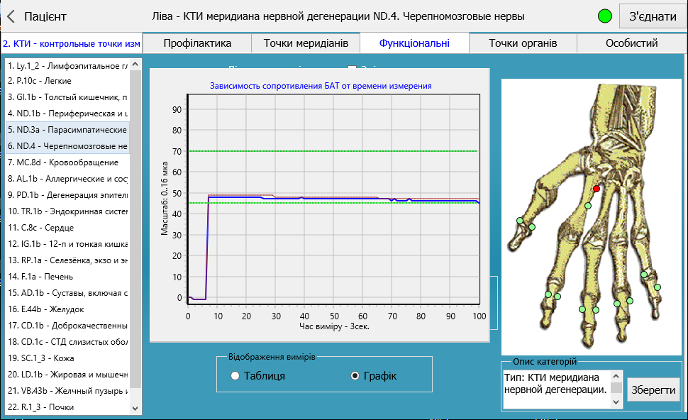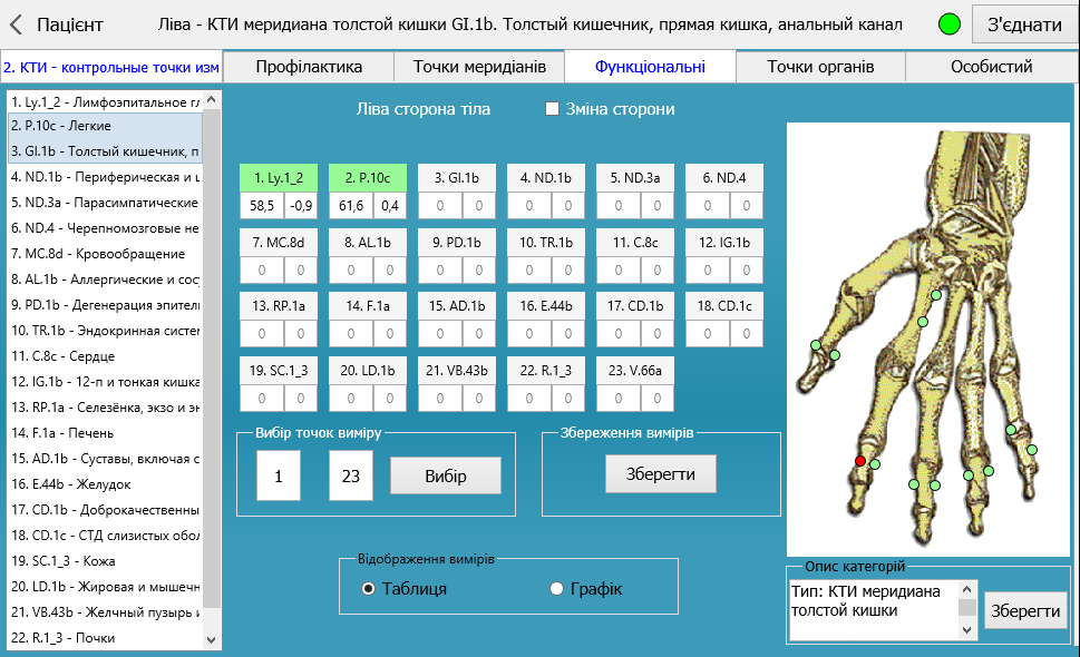 Діагностуйте всі 12 точок Накатані на лівій руці Рис.8. Після заповнення всіх осередків перейдіть на праву руку, поставте галочку в поле «Зміна сторони». Виділіть першу точку та повторіть вимірювання на правій руці. Після заповнення всіх полів натисніть кнопку «Зберегти». Ваші вимірювання будуть збережені, як показано на Рис.8 для пацієнта під ім'ям «Пацієнт» (у автора нестача фантазії). Далі розглядатимемо результати тестування Пацієнта.