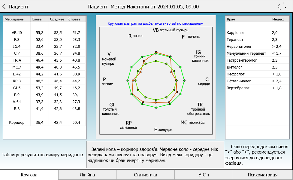 Кругова діаграма має коридор здоров'я Мал.12. Все, що знаходиться всередині коридору, відноситься до збалансованих, здорових меридіанів. Точки, що знаходяться зовні коридору – характеризують меридіан, як меридіан із надлишком енергії, а всередині – меридіан із нестачею енергії. Аналогічна картина з лінійною діаграмою.