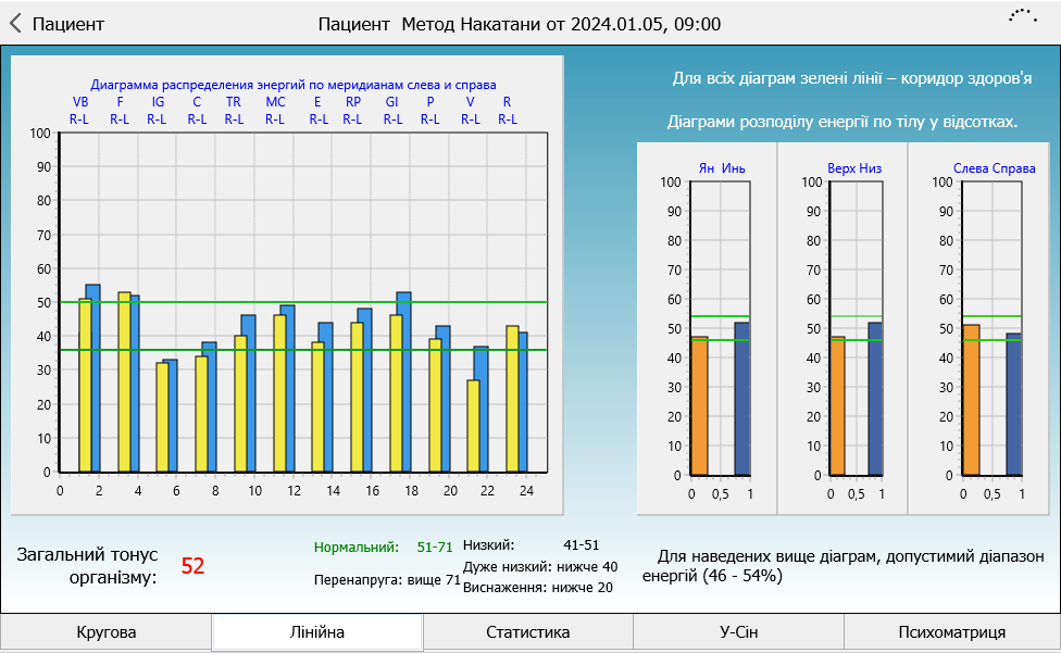 На лінійній діаграмі Мал.12 показані значення правих та лівих точок відповідних меридіанів. Тут обчислюється тонус організму. Тонус організму є важливим параметром, що фіксує стан організму на даний момент і обчислюється він тільки для методу Накатані при вимірі 24 точок (12 ліворуч і 12 праворуч).