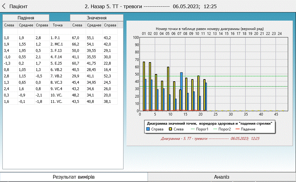 Повертаємось на головну панель. Натискаємо кнопку (ліворуч угорі) «Пацієнт». Вибираємо пацієнта, що діагностується. В «Історії діагностики» з'явився рядок із найменуванням методу вимірювання, датою та часом. Вибираємо цей рядок (натискаємо по ньому). Активуються кнопки «Аналіз» та «Видалення». Кнопка «Видалення» видаляє записи в історії діагностики. Натискаємо кнопку «Аналіз» та переходимо на панель аналізу результатів вимірювань за методом Накатані. Для точок BAP буде інша панель (див. нижче Мал22, Мал.23).