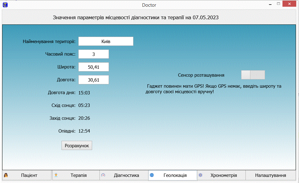 При створенні рецепту терапії важливо враховувати геолокацію. На головній панелі (сторінка "Геолокація") введіть часовий пояс та координати вашої місцевості Мал.19 і натисніть кнопку «Розрахунок».