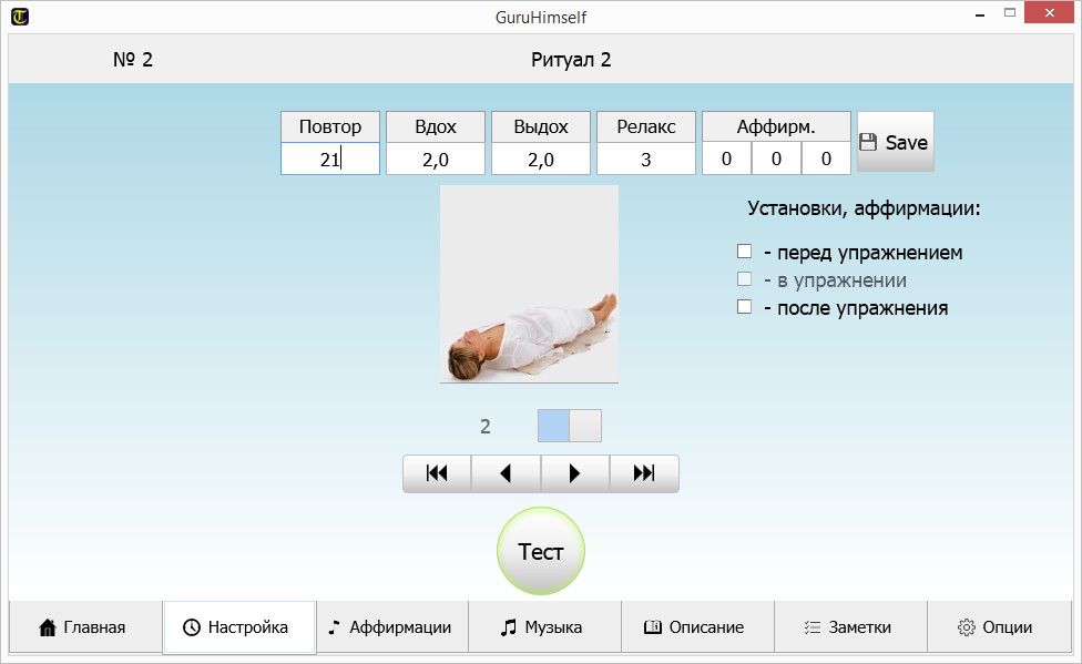 Для каждого вида упражнения вводятся свои значения параметров. Введите значения: количество повторов упражнения «Повтор», длительность упражнения «Время», длительность вдоха «Вдох», длительность выдоха «Выдох», длительность задержки «Задержка», длительность расслабления между упражнениями «Релакс». Кнопка «Save» сохраняет введенные значения параметров упражнения. С права от изображения упражнения находится переключатель, сигнализирующий о включении данного упражнения в комплекс. Навигация по комплексу реализует просмотр всех упражнений, включенных в комплекс. «Описание» - вывод описания упражнения. «Тест» - запуск тестирования упражнения. «Заметки» - позволяют ввести и запомнить комментарии для данного упражнения. В упражнениях йоги можно изменить учет времени упражнения или по дыханию, или по текущему времени. Информационная строка содержит номер