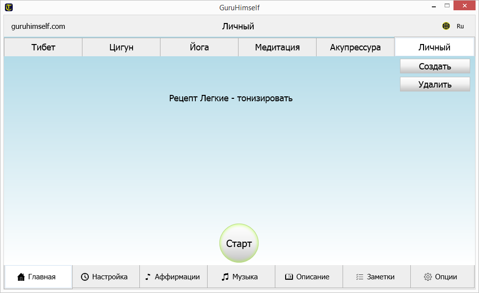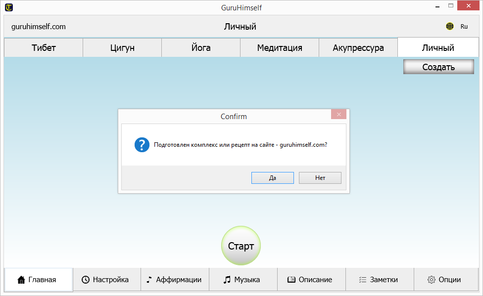 Для создания личного комплекса переходим в "Личный" и нажимаем кнопку «Создать». Приложение задаёт вопрос. Создан ли ваш комплекс на сайте guruhimself.com? Отвечаем отрицательно и переходим на сайт guruhimself.com. На главной странице сайта выбираем меню "Практика" и заходим в одну из пяти базовых практик: Тибет, Цигун, Йога, Акупрессура, Магитя. В раскрывшемся меню выбираем комплекс. На странице комплекса под изображением упражнения, нажимаем кнопку «Выбрать» и таким образом, выбираем желаемые упражнения. В верхнем правом углу над кнопкой «Формирование» указано число выбранных упражнений. После завершения набора упражнений нажимаем кнопку «Формирование» и переходим на страницу «Формирование комплекса». Убеждаемся в соответствии выбранных упражнений и при необходимости, корректируем перечень упражнений. Если Вы авторизированы на сайте, введите наименование создаваемого комплекса и сохраните его. В итоге получите сообщение, что Ваш личный комплекс сформирован и может быть сохранен на вашем гаджете.