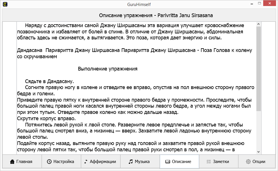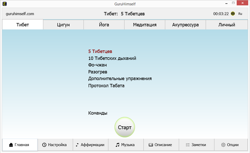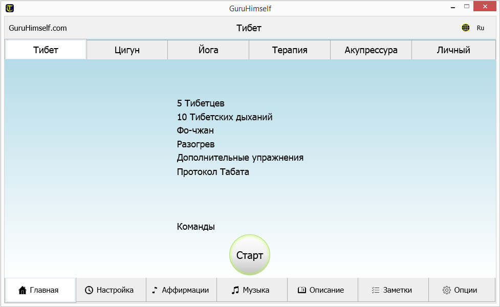 Выберите комплекс, с которым будете работать. Например, выбрали практику «Цигун», а затем комплекс «8 Отрезков парчи». «Старт» запускает выполнение комплекса 8 Отрезков парчи. Нажав «Описание», знакомимся с самим комплексом «8 Отрезков парчи». Кнопки: «Опции», «Настройка», описаны ниже. В информационной строке (верхняя строка) указывается наименование рабочего комплекса и время, которое будет затрачено на выполнение комплекса. При первом нажатии по кнопке "guruhimself" загрузится сайт "guruhimself.com", а при втором - будет показана информация об авторском праве.