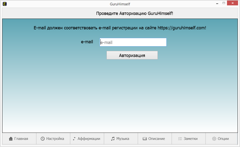 После загрузки и инсталляции приложения, необходимо пройти авторизацию приложения GuruHimself. Для прохождения авторизации приложения, надо быть зарегистрированным на сайте https://guruhimself.com.
