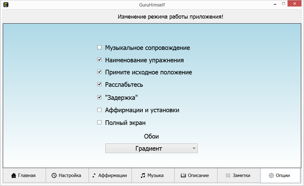 После нажатия на главной форме кнопки «Опции» попадаем на панель “Опции”. На этой панели можно включить или выключить озвучивание фраз «Примите исходное положение», «Расслабьтесь», наименование упражнения, аффирмации, произносимые в паузах между исполняемыми упражнениями. В операционной среде Windows, можно вывести изображение приложения GuruHimself на весь экран. Предоставлена возможность смены фона приложения.