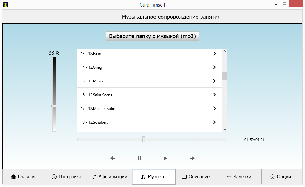 С целью разграничения уровней звука музыкального сопровождения и звука команд приложения GuruHimself в приложение встроен проигрыватель. Музыка подготавливается индивидуально в формате mp3 и загружается с папки “Выберите папку с музыкой (mp3)”. Выберите папку и подтвердите выбор и больше никаких действий. В “Android”, после нажатия кнопки “Загрузите музыку mp3”, звуковые файлы формата mp3 загружаются как с внешней карты памяти, так и с внутренней памяти гаджета.