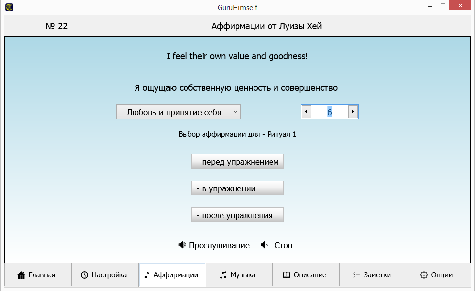 Панель аффирмаций позволяет выбрать и подключить требуемую аффирмацию к упражнению. Аффирмации можно разместить, как в начале упражнения, так и в конце. Прослушивание аффирмаций происходит на выбранном рабочем языке. На каждое последующее упражнение аффирмации устанавливаются индивидуально, согласно своим предпочтениям. На текущий момент в GuruHimself имеется 129 аффирмаций от Луизы Хэй.