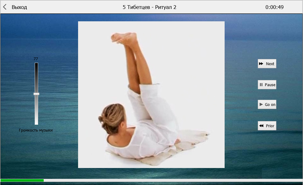После нажатия кнопок "Старт" или "Тест" появляется панель с изображением выполняемого упражнения. Кнопками "Стоп", "Далее", "Выход" управляем прохождением комплекса в целом. Под изображением находится индикатор количества повторов упражнения в одном цикле комплекса. Кнопка "Выход" - выход из выполнения комплекса.
