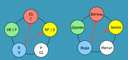 4. Недостатність деструктивного зв'язку веде до того що наступний елемент зв'язку переважає. Наприклад, якщо «вогонь» недостатньо пригнічує на «метал», то останній посилюється.
