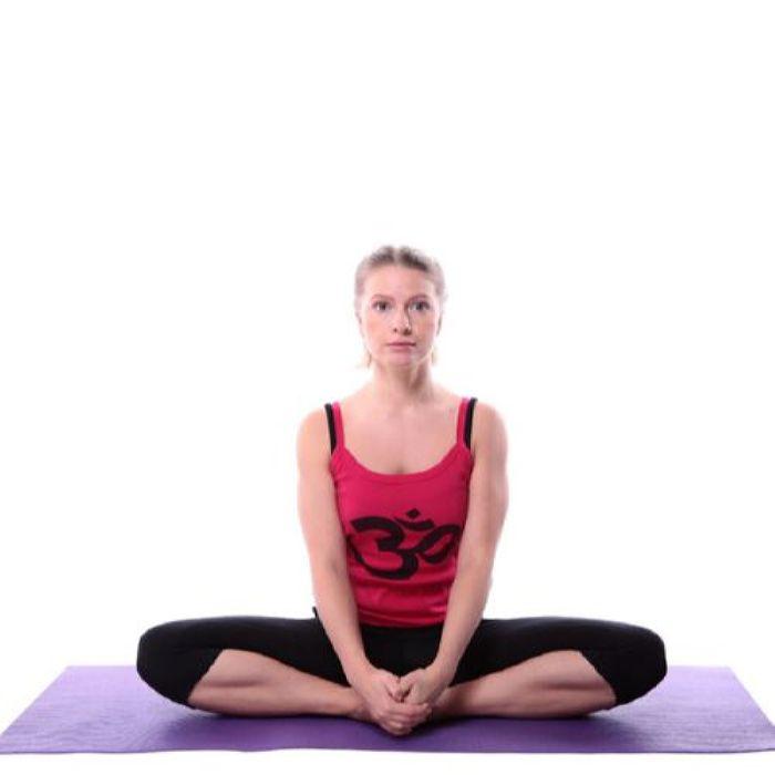 Разведите колени в стороны и соедените ступни между собой, согните и руками подведите пятки к промежности.