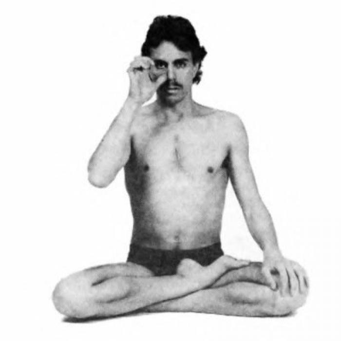ВыбратьСядьте скрестив ноги, спина прямая. Закройте правую ноздрю большим пальцем правой руки, как показано на фото, и медленно вдыхайте через левую ноздрю на четыре счета.