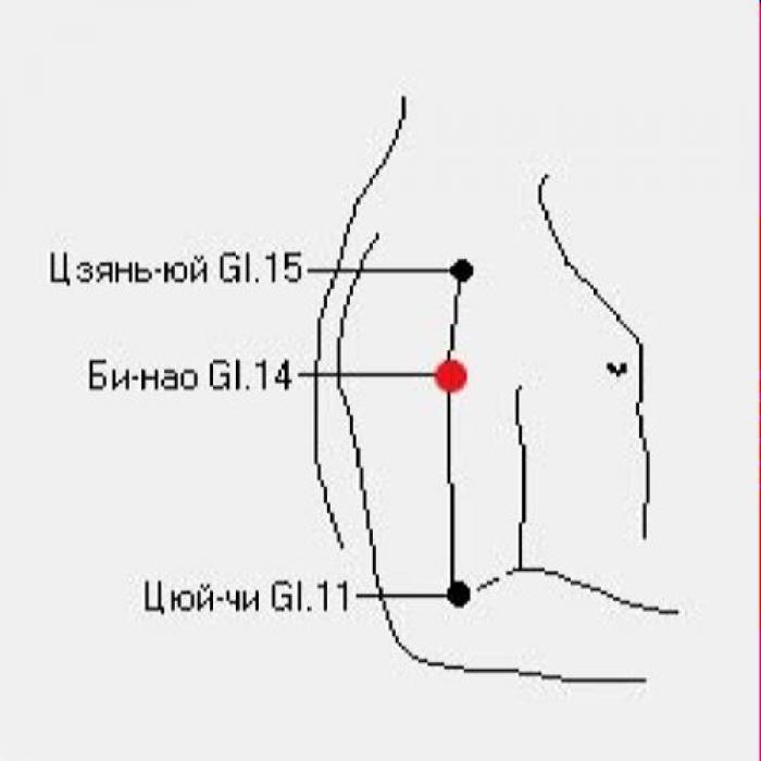 Название: «би» — «плечо»; «нао» — «мышцы плеча (дельтовидная мышца и двуглавая мышца плеча)». Точка Би-нао GI.14 расположена на плече в области дельтовидной мышцы, отсюда и название.