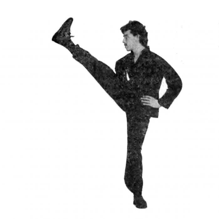 Не прогибаясь в спине, сделайте мах в сторону левой ногой.