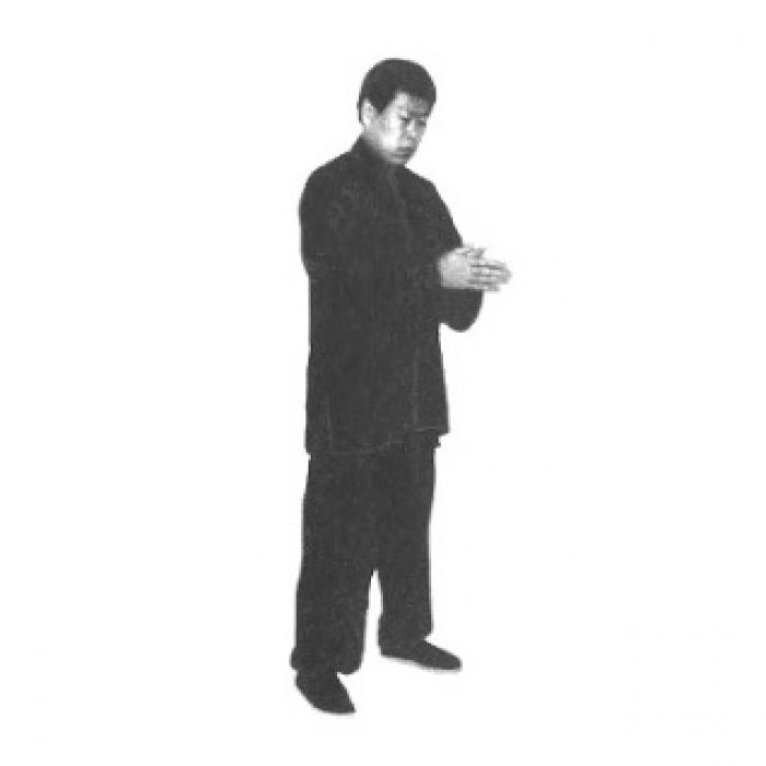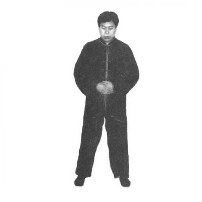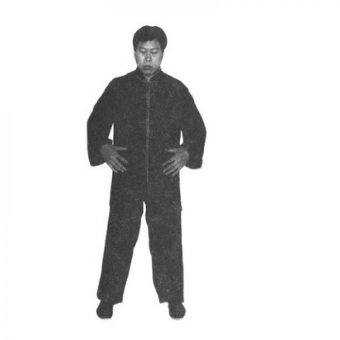 Выбрать1. Исходное положение - ноги на ширине плеч, ступни параллельны, колени немного согнуты, спина прямая, для чего таз немного подается вперед. (Можно отрегулировать положение тела так, будто кроме ног есть третья точка опоры - хвост, как у кенгуру.) Подбородок немного опущен, чтобы шея была выпрямленной. При этом голова как бы подвешена за макушку. Тело расслаблено. Язык прикасается к верхнему нёбу, глаза прикрыты.