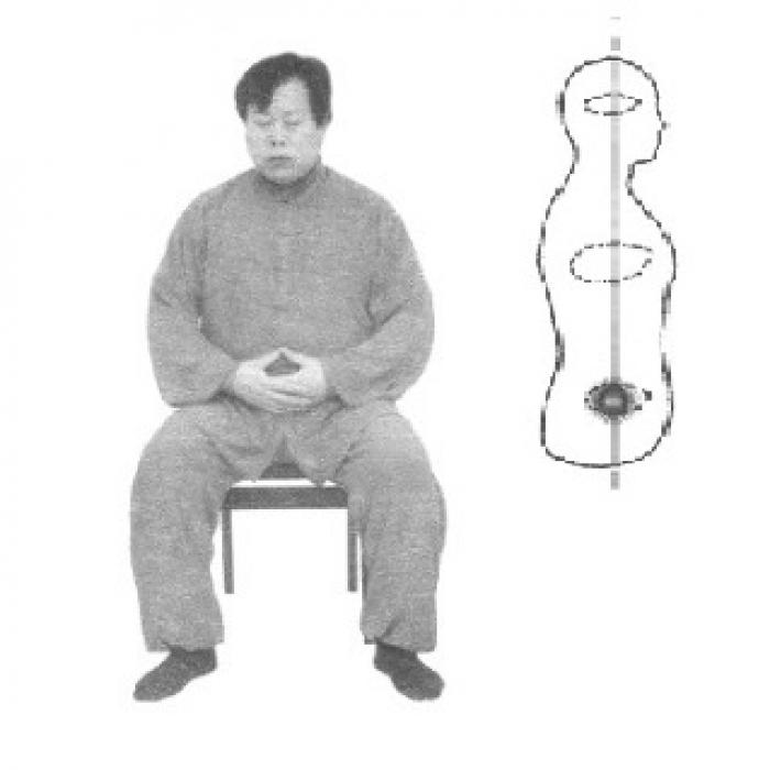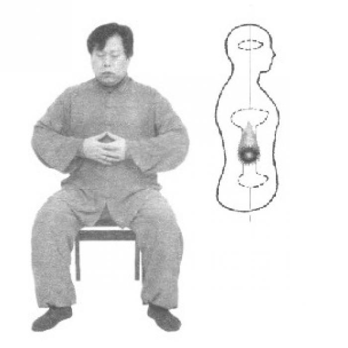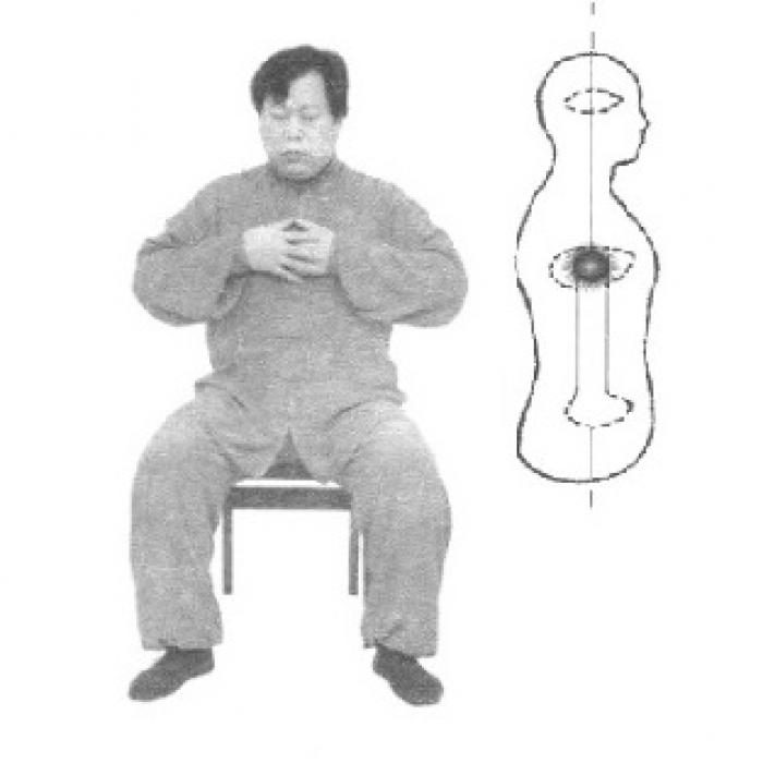Выбрать1. Исходное положение: сесть в любую из вышеперечисленных поз. Спина прямая. Руки сложить на область пупка, как и при выполнении ян-ци, но большие пальцы соприкасаются, как и при завершении 5-го и 6-го подготовительных упражнений.