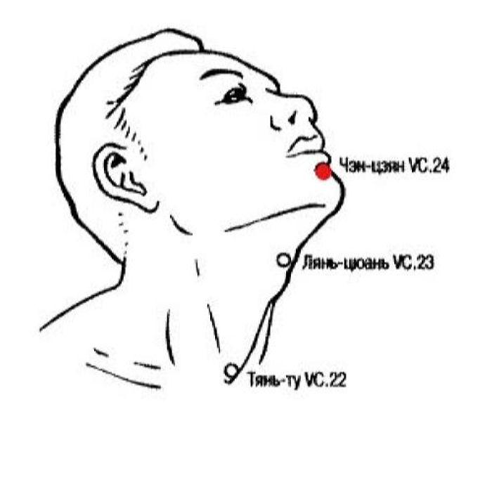 2. В точке Чэн-цзян VC.24 соединяются сосуды Жэнь-май и Ду-май. Сосуд Жэнь-май управляет Инь, а сосуд Ду-май управляет Ян. Следовательно, точку можно использовать при различных нарушениях баланса между Инь и Ян, в первую очередь, при асимметрии лица, опущении угла рта, гемиплегии. К этой категории болезней можно отнести сумасшествие (маниакальное или депрессивное состояние), апоплексию (синдромы закупорки Ци или отхождения Ян), эпилепсию и судороги у детей. Именно поэтому Сунь Сымяо (581 — 682 гг.) отнес Чэн-цзян VC.24 к группе «тринадцати точек черта», предназначенных для лечения сумасшествия, успокоения жизненного духа Шэнь.