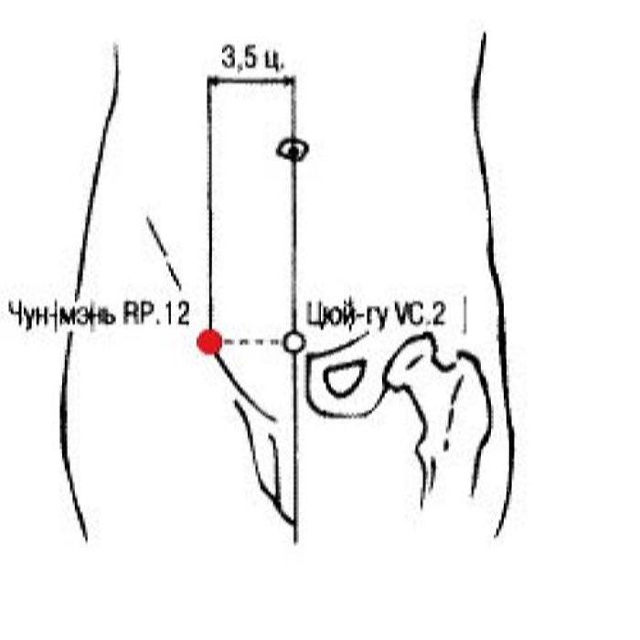 Функции: точка Чун-мэнь RP.12 относится к ножному тай-инь каналу селезенки. Селезенка управляет транспортировкой и трансформацией сырости. Ослабление Ци селезенки может привести к нарушению водного обмена, скоплению сырости и образованию флегмы. Чун-мэнь RP.12 расположена в паховой области вблизи половых органов, почек и мочевого пузыря, способствует устранению сырости и флегмы при некоторых заболеваниях мочеполовой системы.