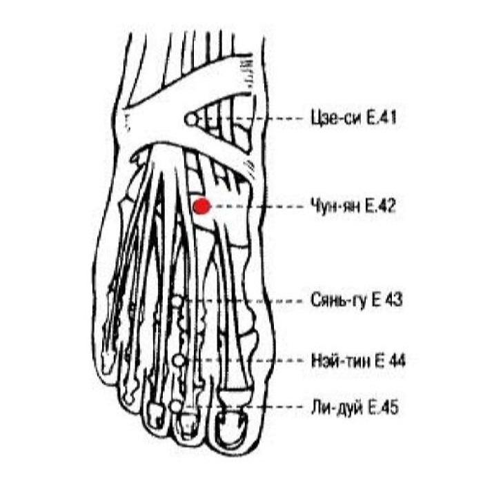 1. Чун-ян E.42 — точка первичной Ци ножного ян-мин канала желудка. Патологические изменения в определенном цзанфу-органе часто отражаются на точке первичной Ци соответствующего канала, воздействие на нее имеет важное значение при лечении этого органа.
