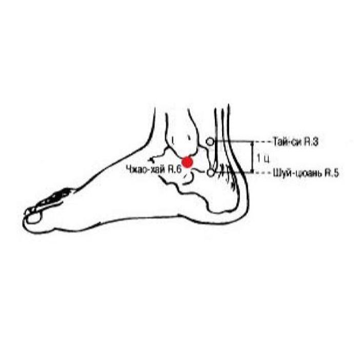 2. Точка Чжао-хай R.6 относится к ножному шао-инь каналу почек. Почки хранят квинтэссенцию Цзин, управляют развитием и воспроизводством, то есть тесно связаны с половой функцией. Этим объясняется эффективность Чжао-хай R.6 при лечении женских болезней со свойствами недостатка Ци почек — альгоменореи, белей, выпадения матки, дисменореи, задержки плаценты. Точку также можно использовать при зуде вульвы, возникающем из-за скопления сырости-жара в Ся-цзяо — нижней части Сань-цзяо.