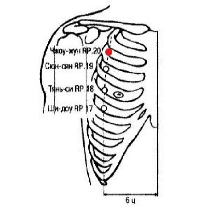 Название: «чжоу» — «все [тело]»; «жун» — «питательная Ци». Точка Чжоу-жун RP.20 относится к ножному тай-инь каналу селезенки. Селезенка является источником образования питательной Ци и крови, распространяет их по всему телу. Чжоу-жун RP.20 расположена немного ниже точки Чжун-фу Р.1 — первой точки канала легких, точки пересечения ручного тай-инь канала легких и ножного тай-инь канала селезенки. Когда нарушается связь канальной Ци селезенки и легких, возникают чувство переполнения в грудной клетке и затрудненное глотание. Иглоукалывание и прижигание точки содействует восстановлению циркуляции в каналах и соединению канальной Ци селезенки и легких. Вдыхаемая легкими Ци соединяется с питательной Ци, полученной путем трансформации пищи селезенкой, и распространяется по всему телу. Таким образом, использование точки способствует распространению питательной Ци по всему организму.