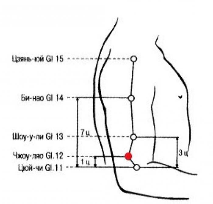 Функции: основными показаниями для использования точки Чжоу-ляо GI.12 являются различные нарушения по ходу ручного ян-мин канала толстого кишечника на верхней конечности. Ее применение способствует восстановлению свободной циркуляции Ци и распрямлению сухожилий, устранению нарушений двигательной функции верхней конечности.