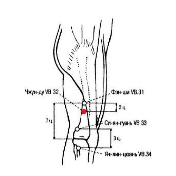 Локализация: на наружной поверхности бедра, на 2 цуня ниже точки Фэн-ши VB.31, на 5 цуней выше уровня подколенной складки.