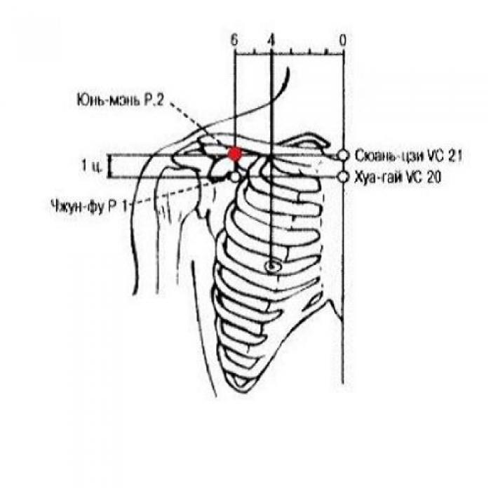 Локализация: на 6 цуней кнаружи от передней срединной линии (точки Хуа-гай VC.20), на прямой линии, проходящей на 2 цуня кнаружи от соска (у мужчин), в I межреберном промежутке, на 1 цунь ниже точки Юнь-мэнь Р.2 (рис. 1).