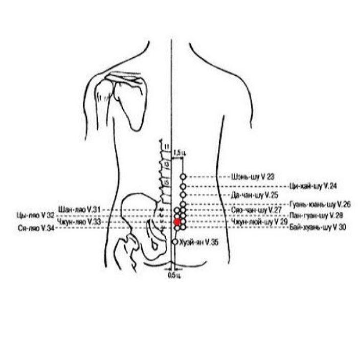 • Боль в пояснице, втяжение яичка: Шан-ляо V.31, Цы-ляо V.32, Чжун-ляо V.33, Ся-ляо V.34.