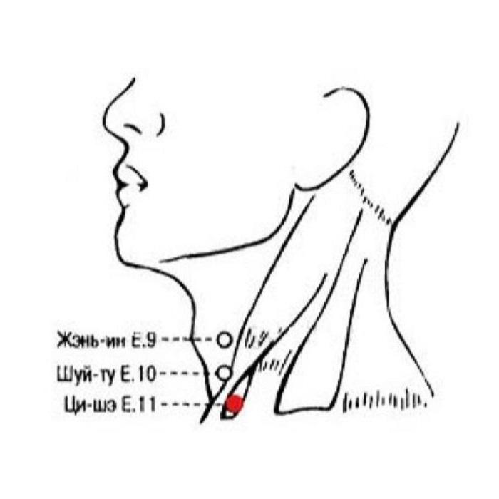 2. Ци-шэ E.11 является важной локальной точкой лечения различных заболеваний горла и шеи — боли и отечности слизистой оболочки горла, ощущения инородного тела в гортани, зоба, напряжения шейных и затылочных мышц.