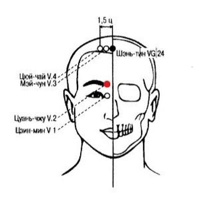 Локализация: в углублении у внутреннего края брови, прямо вверх от точки Цзин-мин V.1.
