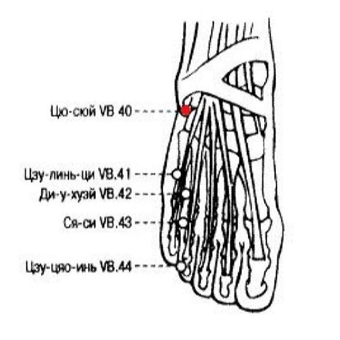 2. Цю-сюй VB.40 — точка первичной Ци ножного шао-ян канала желчного пузыря, важная точка лечения болезней желчного пузыря и печени, канал которой имеет наружно-внутреннюю взаимосвязь с каналом желчного пузыря. Точка используется при возгорании огня печени и желчного пузыря, сырости-жаре в печени и желчном пузыре, застое Ци печени и внутренней активации ветра печени.