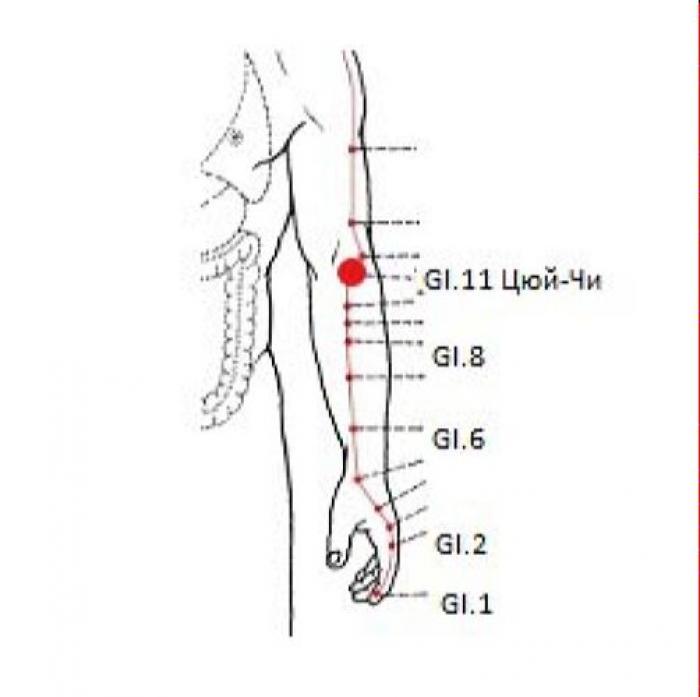 1. Точка Цюй-чи GI.11 относится к ручному ян-мин» каналу толстого кишечника, является одной из ключевых точек лечения болезней толстого кишечника. Кроме того, Цюй-чи GI.11 является точкой-устьем этого канала. Согласно записям в канонах «Лин шу» и «Нань цзин» (Канон трудностей), точки-устья эффективны при лечении всех заболеваний желудка, кишечника и других фу-органов.