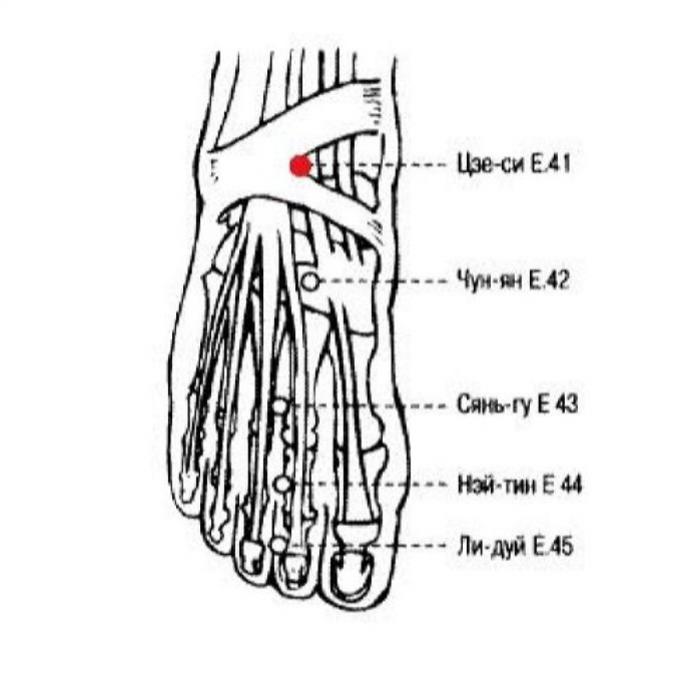 • Боль в стопе: Шан-цю RP.5, Цзе-си Е.41, Цю-сюй VB.40.