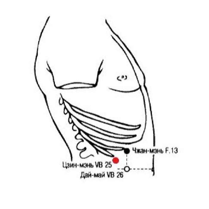 • Вздутие живота, понос: Цзин-мэнь VB.25, Тянь-шу Е.25, Ян-лин-цюань VB.34.