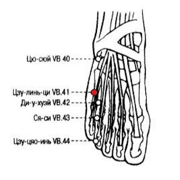 4. Цзу-линь-ци VB.41 — точка-быстрина ножного шао-ян канала желчного пузыря. Согласно записям в каноне «Пань цзин» (Канон трудностей), точки-быстрины можно использовать при лечении тяжести в теле и боли в суставах.
