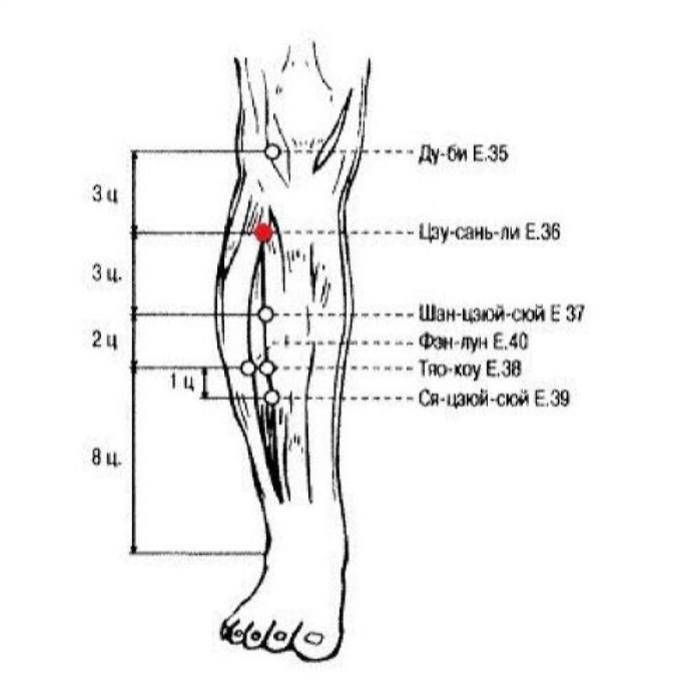 1. Цзу-сань-ли Е.36 — точка-устье ножного ян-мин канала желудка. Достигая точек-устьев, канальная Ци становится обильной, как вода в устье реки, впадающей в море. Точки-устья всех каналов можно использовать при лечении болезней желудка, кишечника и других фу-органов, однако самой эффективной в лечении этих болезней является точка-устье канала желудка Цзу-сань-ли Е.36. Желудок относится к элементу Земля, точки-устья каналов фу-органов также относятся к элементу Земля, поэтому Цзу-сань-ли Е.36 можно назвать «точкой-Землей канала-Земли» или «Землей в Земле». Кроме того, Цзу-сань-ли Е.36 — точка-устье желудка на нижних конечностях. В каноне «Су вэнь» говорится: